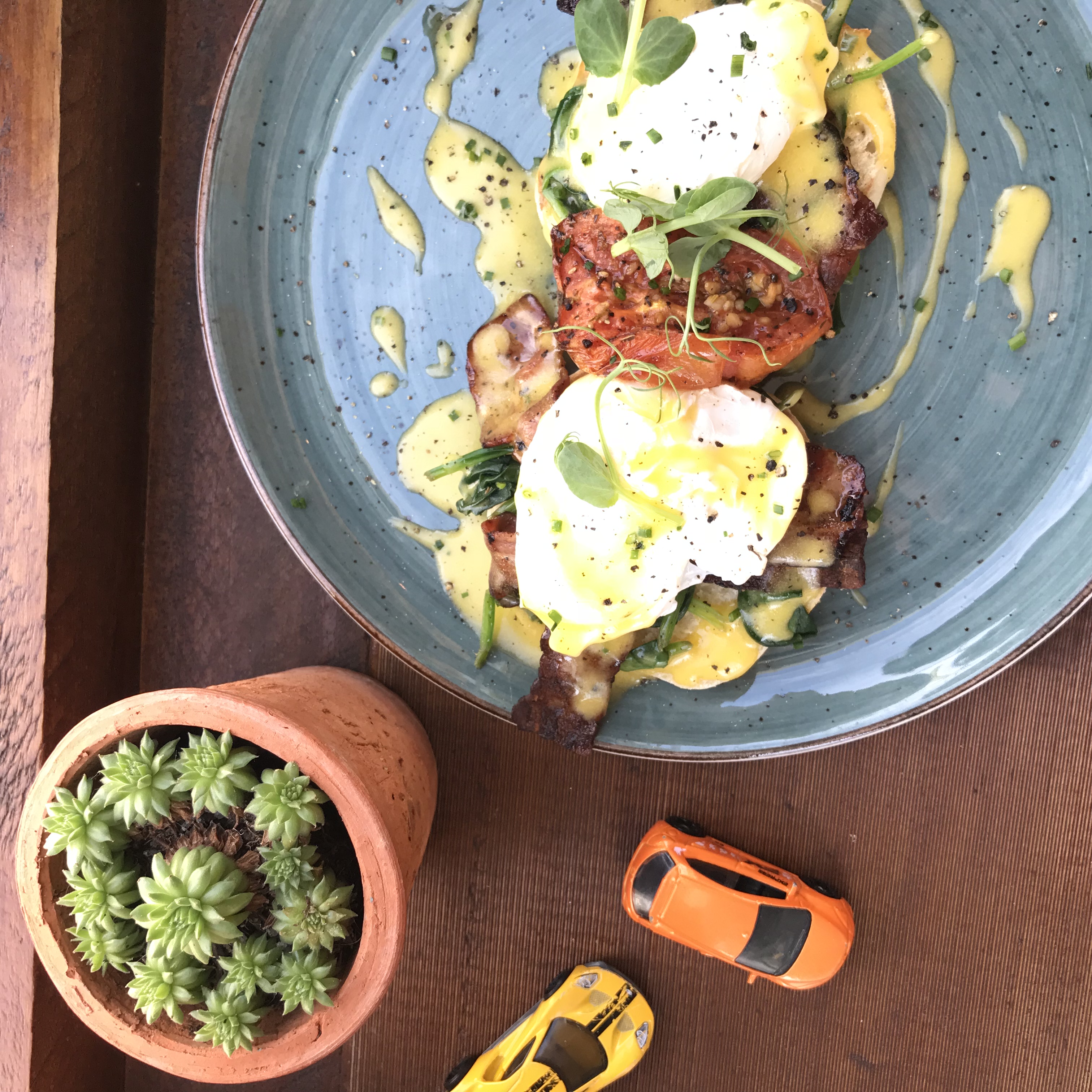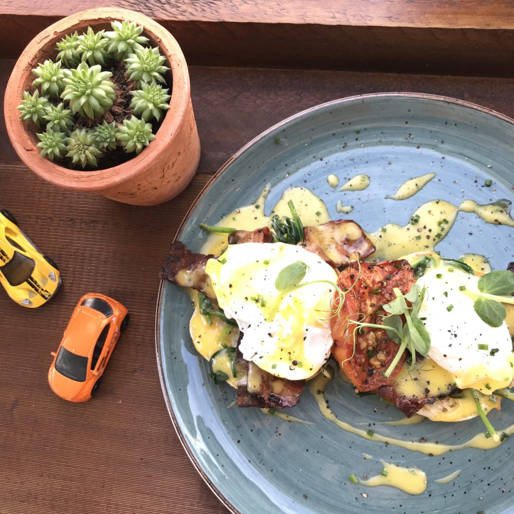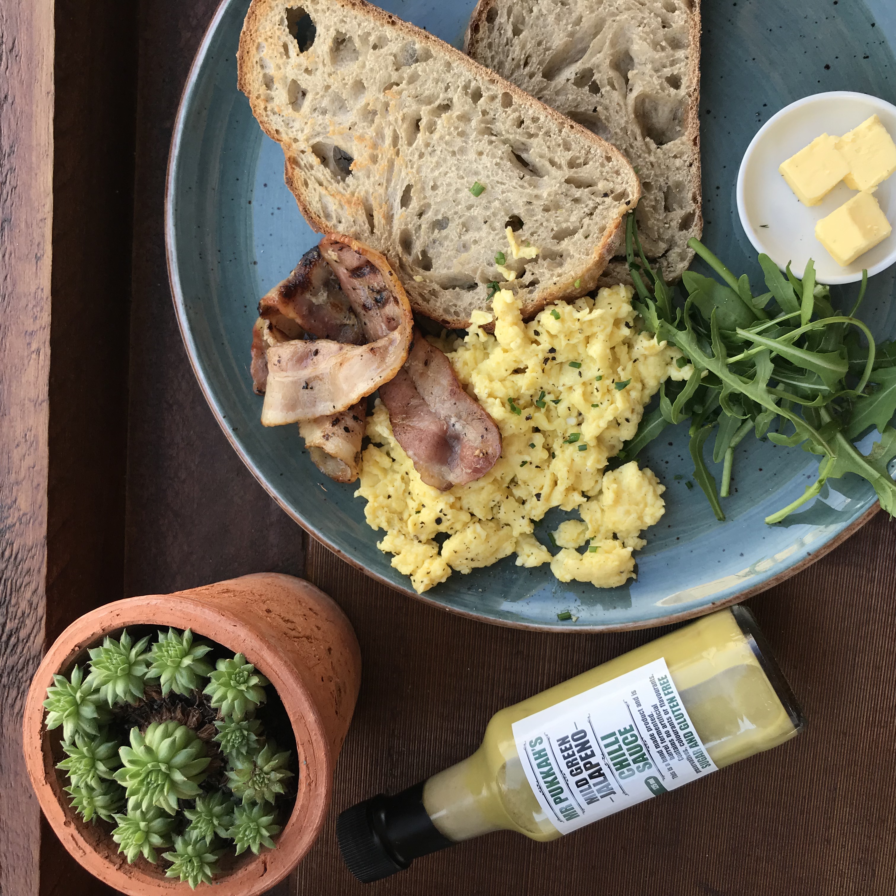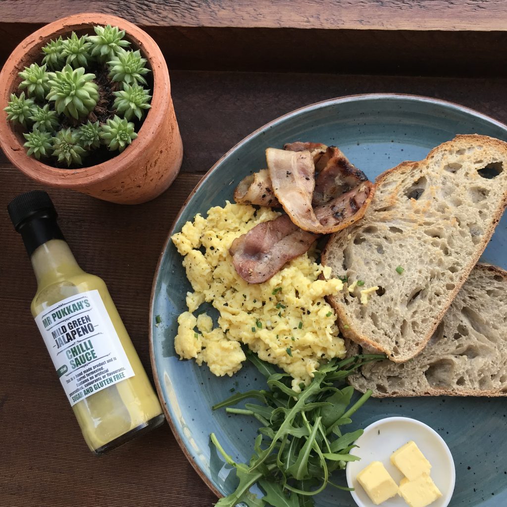 Tables are situated on the little patio, with a few inside too. There are deli items on display for purchase inside the store – cured meats, jams, spreads, hot sauces, pasta, breads…I also think they are serving one of the best Eggs Bennie’s around. Nic had the Eggs Bennie and told me so. He always has the Eggs Bennie, he’s a seasoned pro at that order & I have to say, it did look super scrummy. I opted for my usual preggie breakfast go-to: scrambled eggs, toast, bacon – it was good. Ash slurped down a delish hot choccie *I had to test it to make sure it wasn’t too hot, OK?!*. Super food smoothies are also on offer, as well as a host of other breakfast choices – I will totally be ordering the Cushty Classic on our next visit. PSA: ask for some of Mr Pukkha’s Mild Green Jalapeno Chilli Sauce to accompany your eggs – yaaaaasssss!
