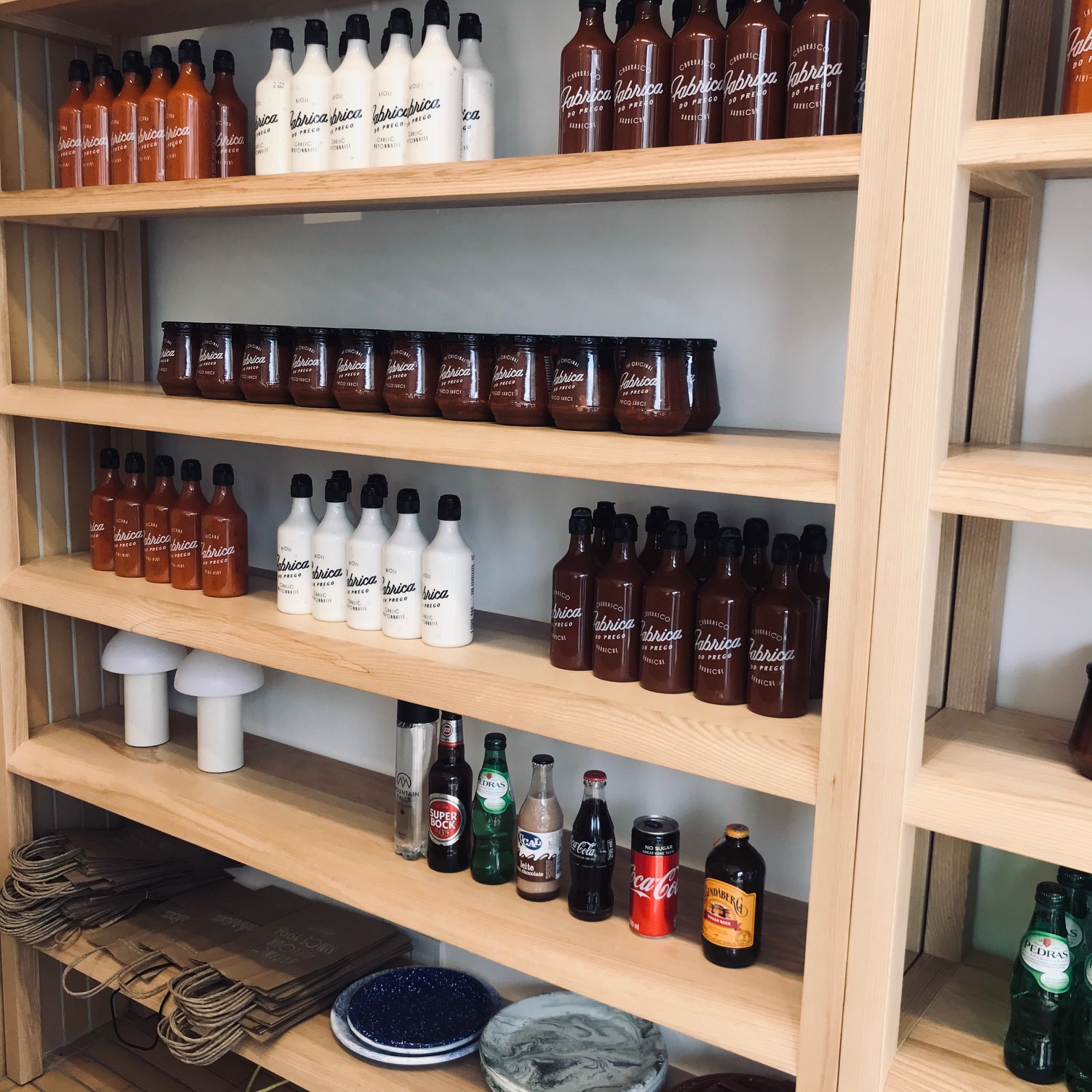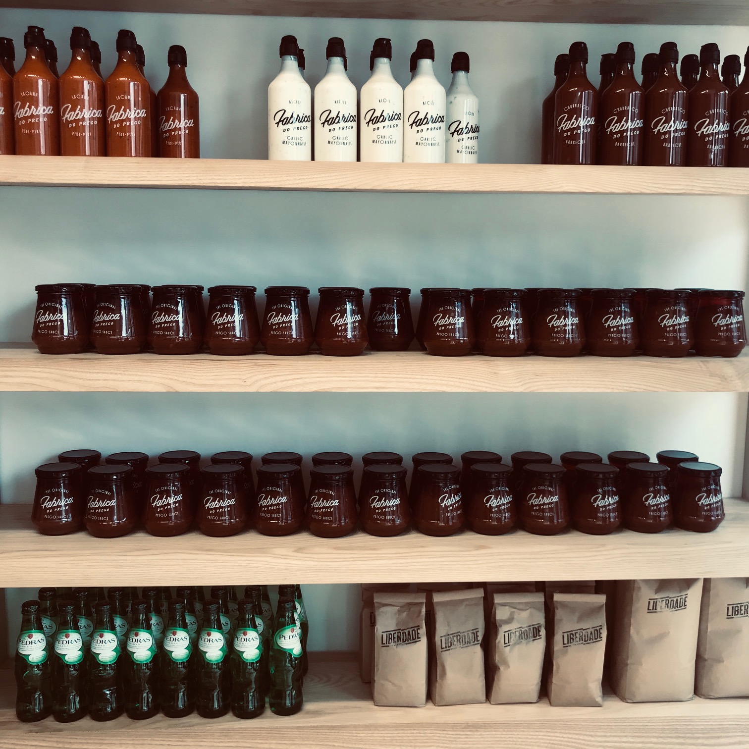 Back to the ordering. We opted for two Chicken Pregos (grilled free-range chicken breast served with cos lettuce, sliced tomato and Prego Sauce) and one Steak Prego (consisting of the same as the chicken, except with grilled sirloin) with the additon of a family-size box of chippies (hand-cut and double fried, with a choice of sauce). I knew the kids would be eating most of the chips as I guessed that the actual pregos would be too spicy for them. Other prego varieties on offer that sounded delish were: Chorico, tuna and mushroom (vegan option). Grilled spatchcock chickens, espetada, various salads (green, colesalw, couscous and 3 Bean), as well as sauteed brussel sprouts were also on offer. The service was swift and I happened to come at an odd time – kids supper time, so they weren’t busy and the order was out in ten minutes. During my short wait I snapped a few pics of their merch, yes, Fabrica has their own line of edible merch, think Prego Sauce, Coriander Aioli, Churrasco Barbecue and Peri-Peri. They have brown bags of Liberdade Coffee Beans for sale too. That would probably go down a treat with a Pasteis De Nata.