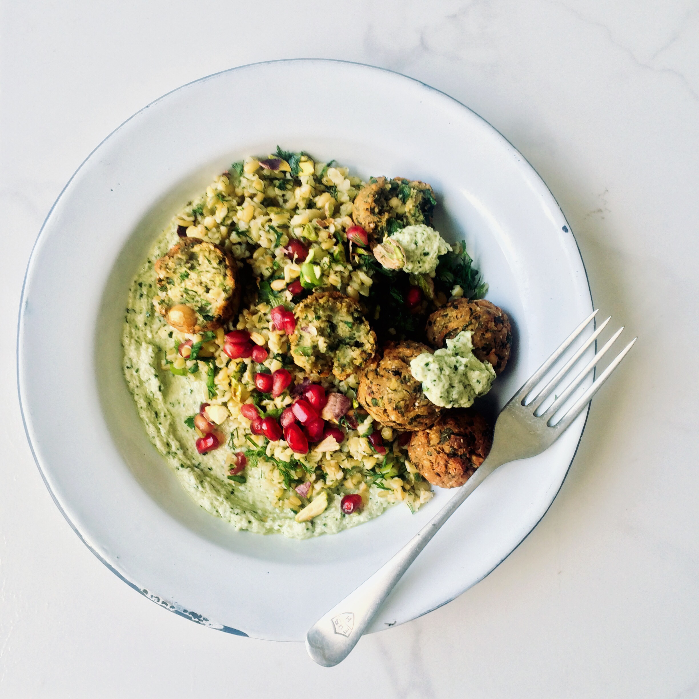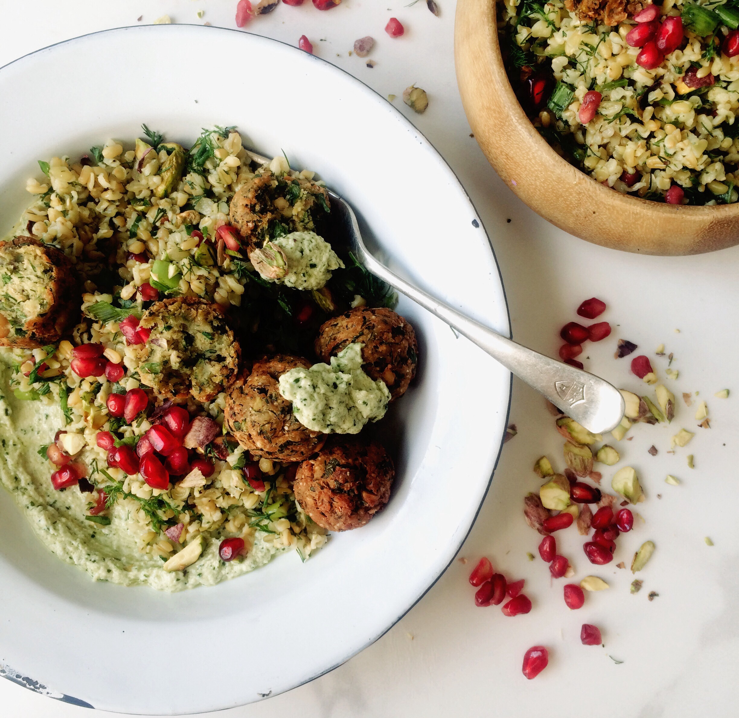 Green Falafel with Green Freekeh Tabbouleh Salad & a Yoghurt & Tahini Sauce