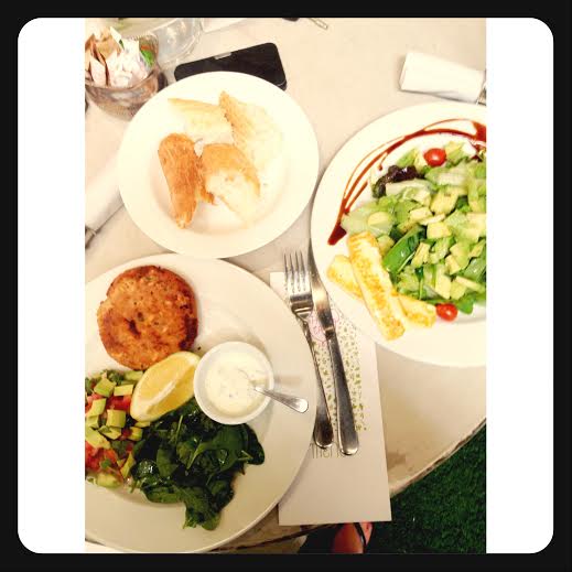 * A mighty impressive homemade salmon fish cake – clearly, size does matter {LARGE}. Fresh, crisp baby spinach leaves, tomato & avo salsa & a yoghurty dressing. When simple is done right, it’s a beautiful, beautiful thing.