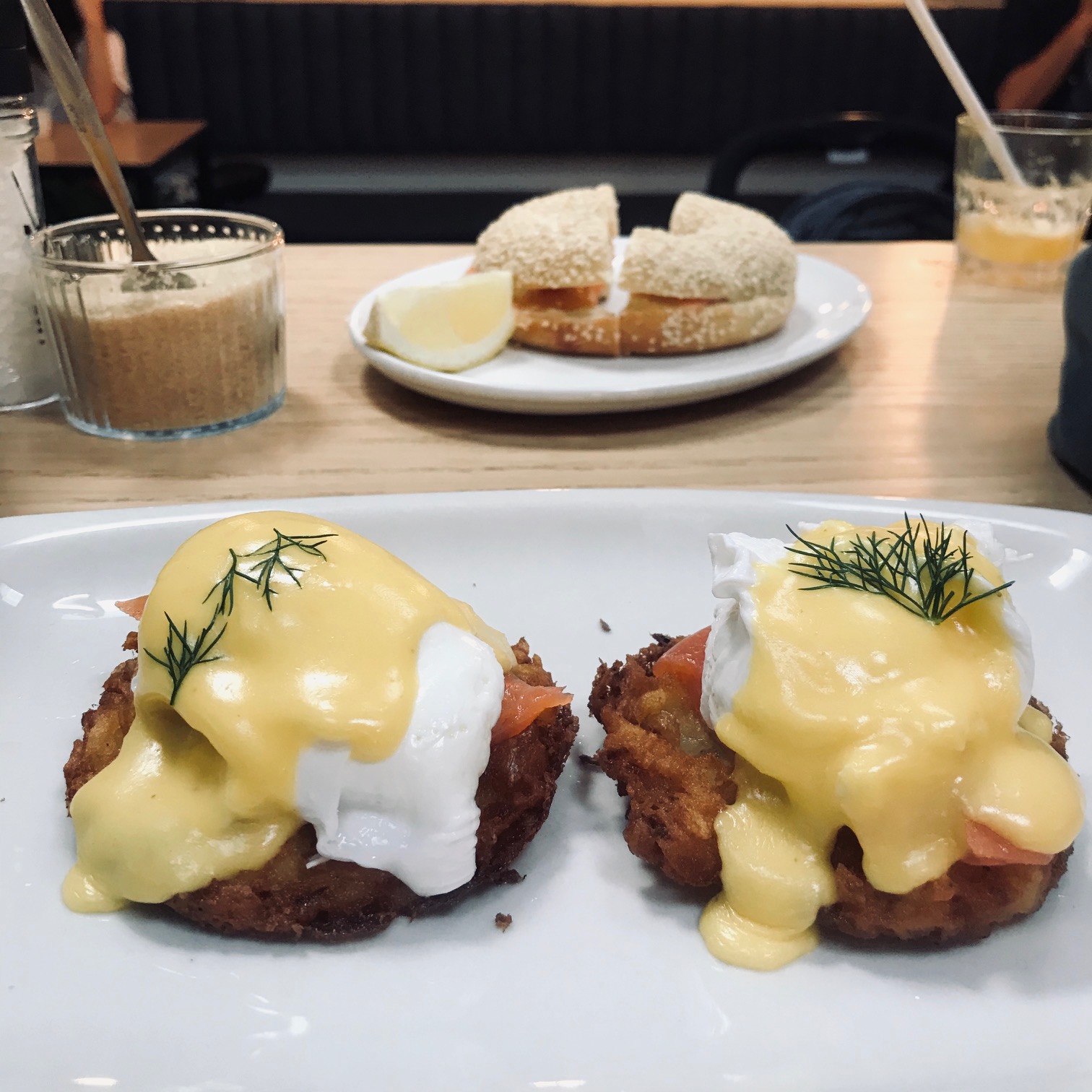 - Nic: Latke Benedict- potato latkes, two poached eggs, smoked salmon and hollandaise sauce.