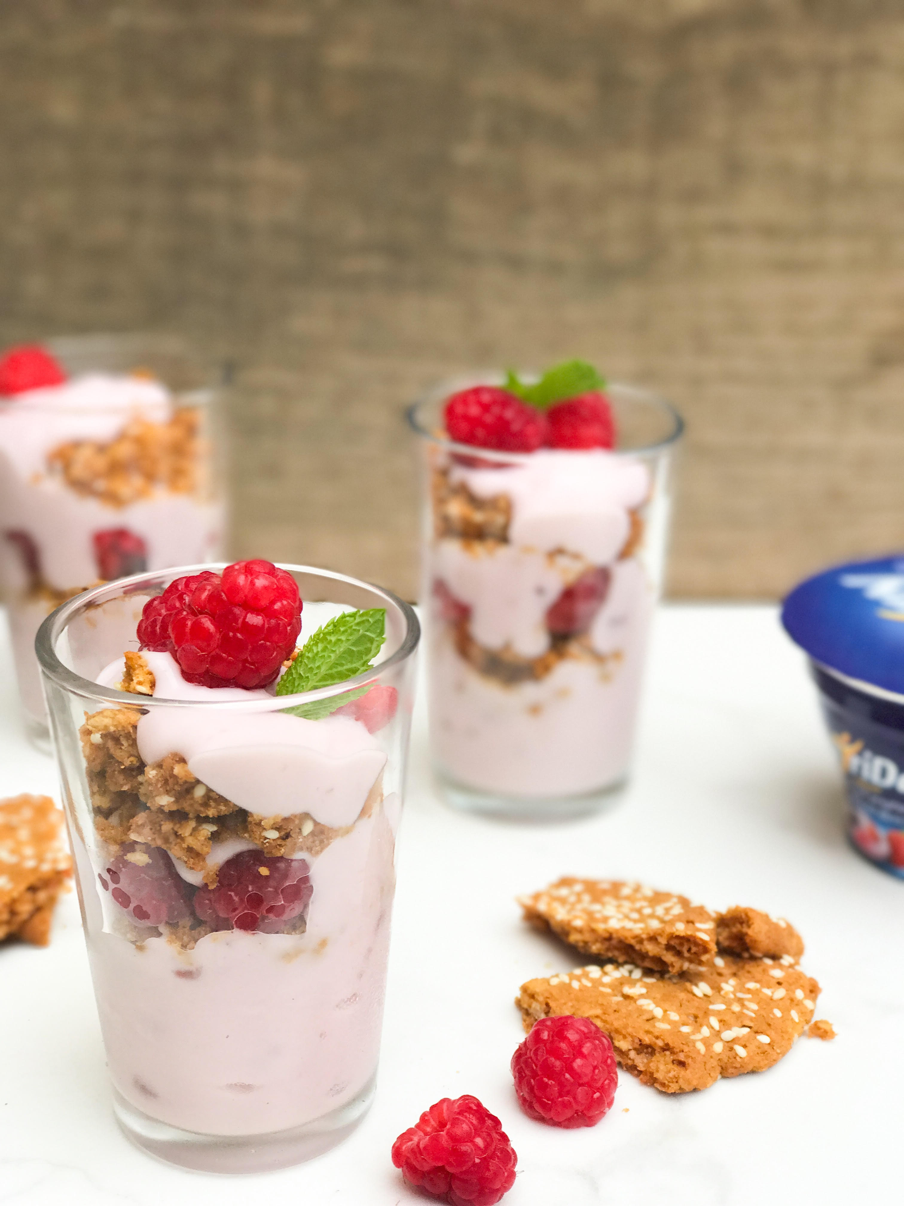 Repeat with another layer of yoghurt, followed by crushed biscuits and mixed fresh berries until you reach the top of the glass (leaving some room for the topping).