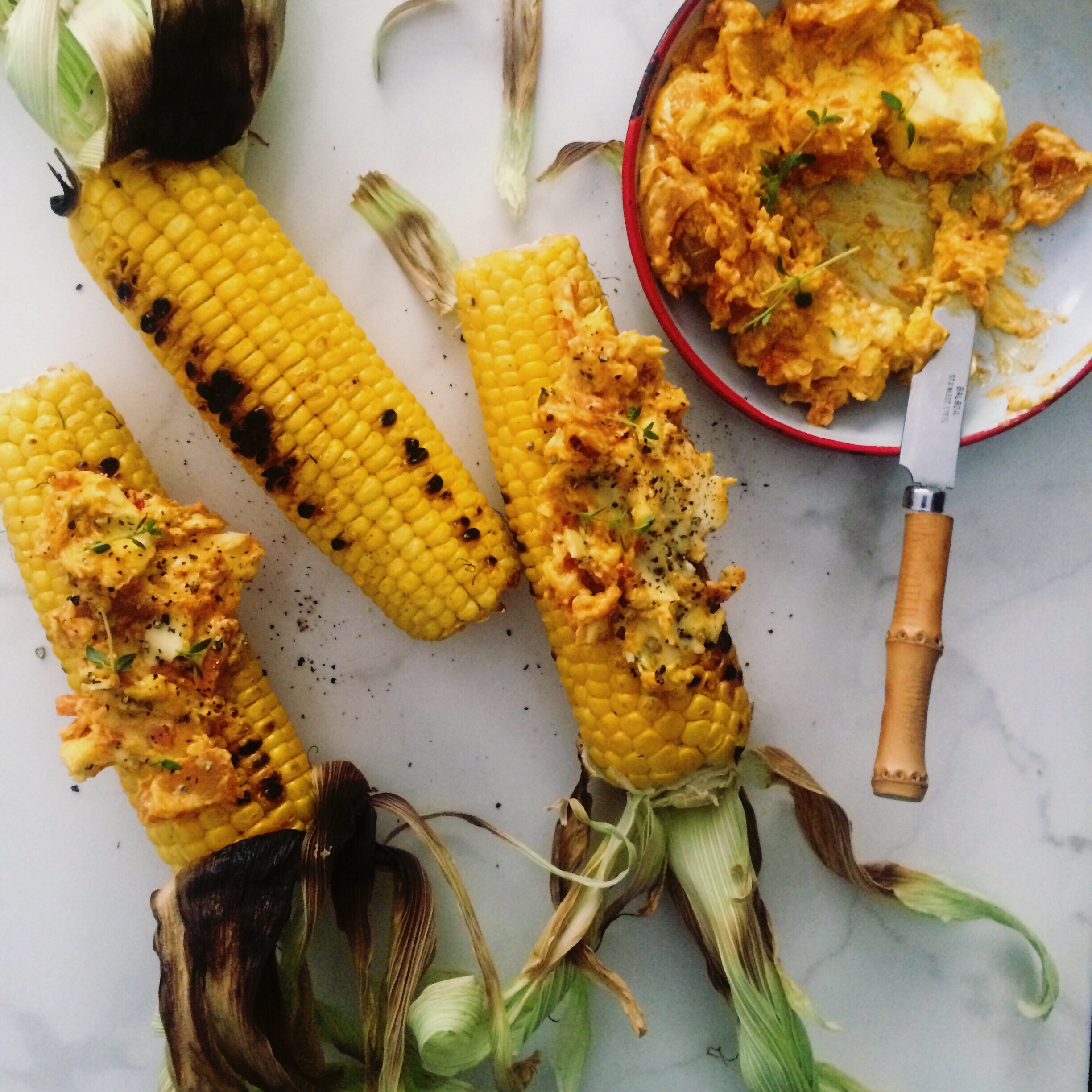 6 Place the mielies on a serving platter and add a dollop of Atchar butter to each mielie. Scatter with additional fresh thyme leaves, just before serving.