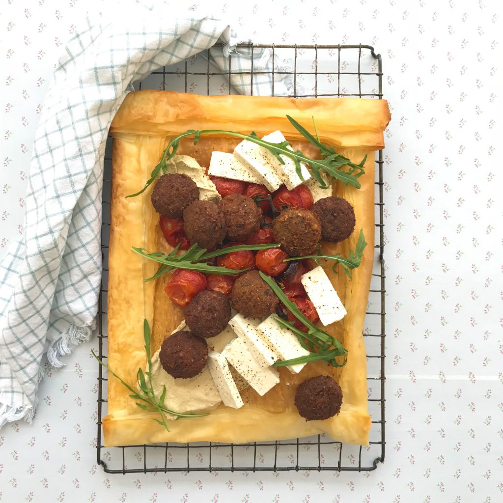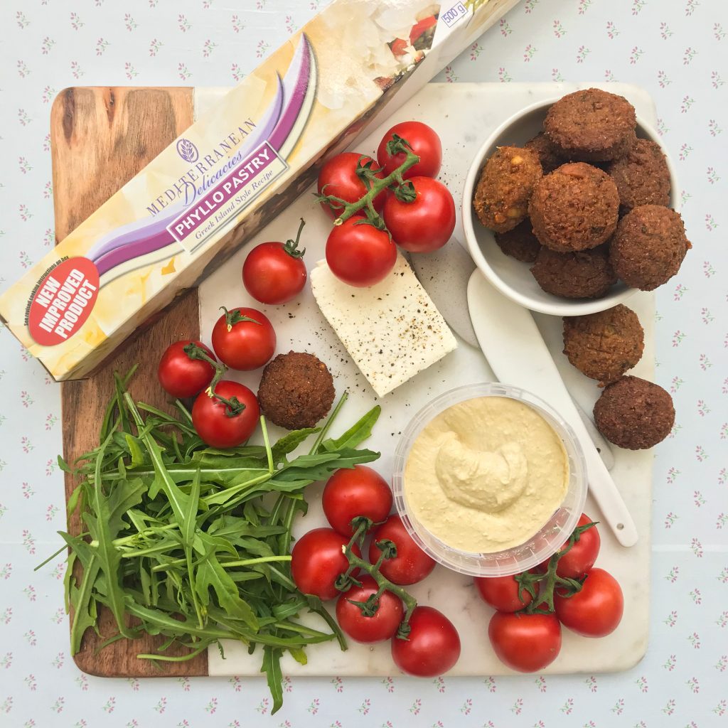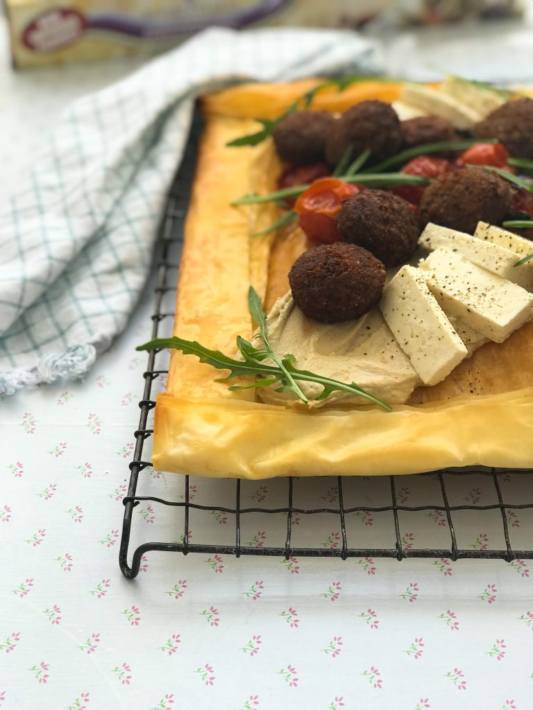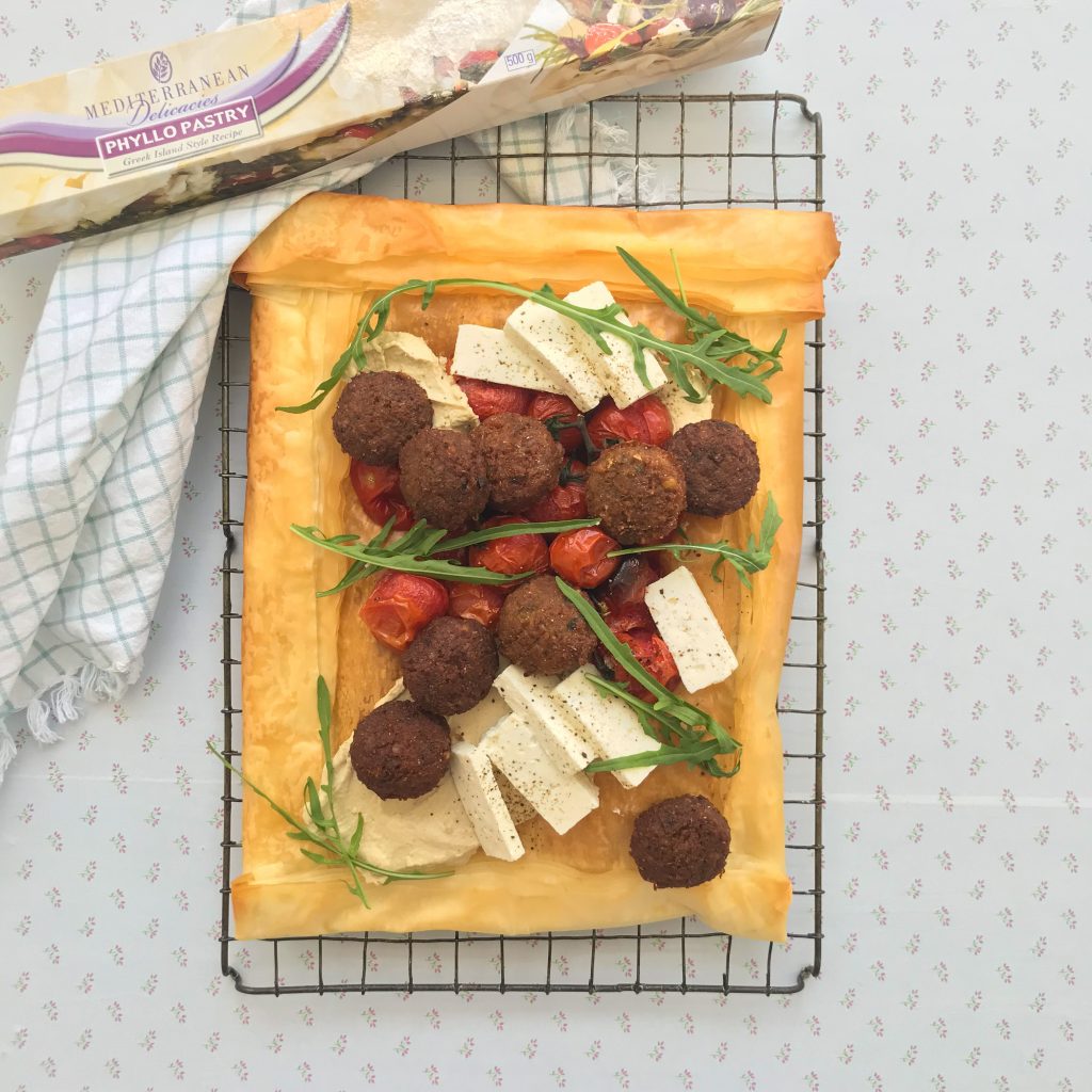 The Med Deli team asked me to come up with a recipe using their phyllo pastry. That wasn’t very hard because quite honestly, I turned to my trusty open phyllo pie recipe. A crisp, golden phyllo base, topped with humus (I used the Mediterranean Delicacies variety because – well, think back to that opening paragraph), roasted vine tomatoes (easy), Feta cheese (salty goodness), falafel (also store bought from my local deli because, well, first paragraph) and wild rocket (for that peppery bite).
