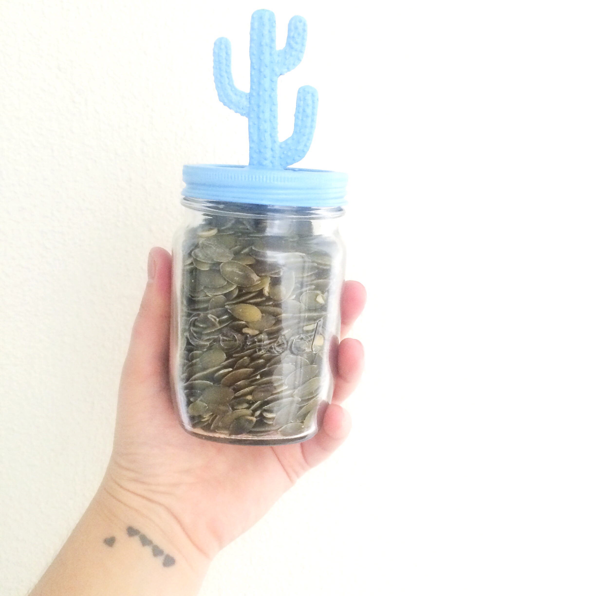 My second glass recycling idea made use of all of my used Consol preserve jars… say hello to your new pumpkin seed storage vessel. Well, any kind of seed or grain storage vessel, really. Add a lick of paint to the lid, paint something plant related in the same colour & add a drop or two super glue. I used a plastic cactus that I found in Asha’s toy box. Hello pretty kitchen storage container!