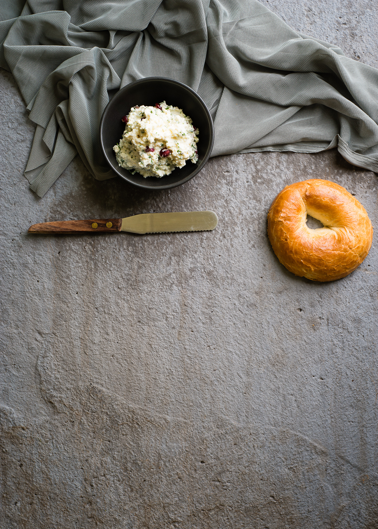 Combine the ricotta cheese, lime juice, dill, olive oil & pomegranate rubies. Season with salt & pepper. Mix well. Serve with *proper* boiled bagels. Easy.