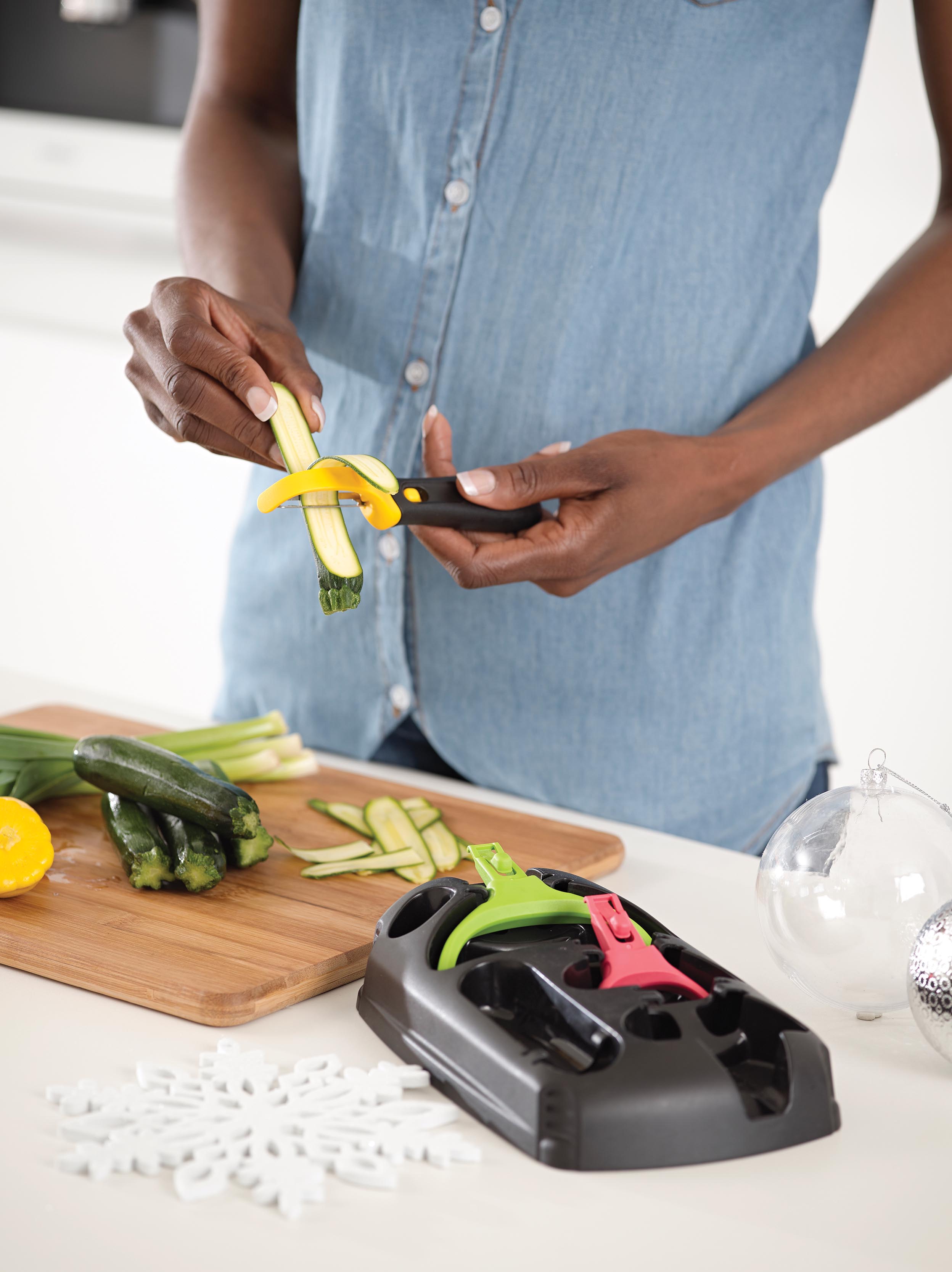 - One Vertical Head – for peeling hard fruit & vegetables (bye bye dangerous butternut peeling attempts, bye bye).